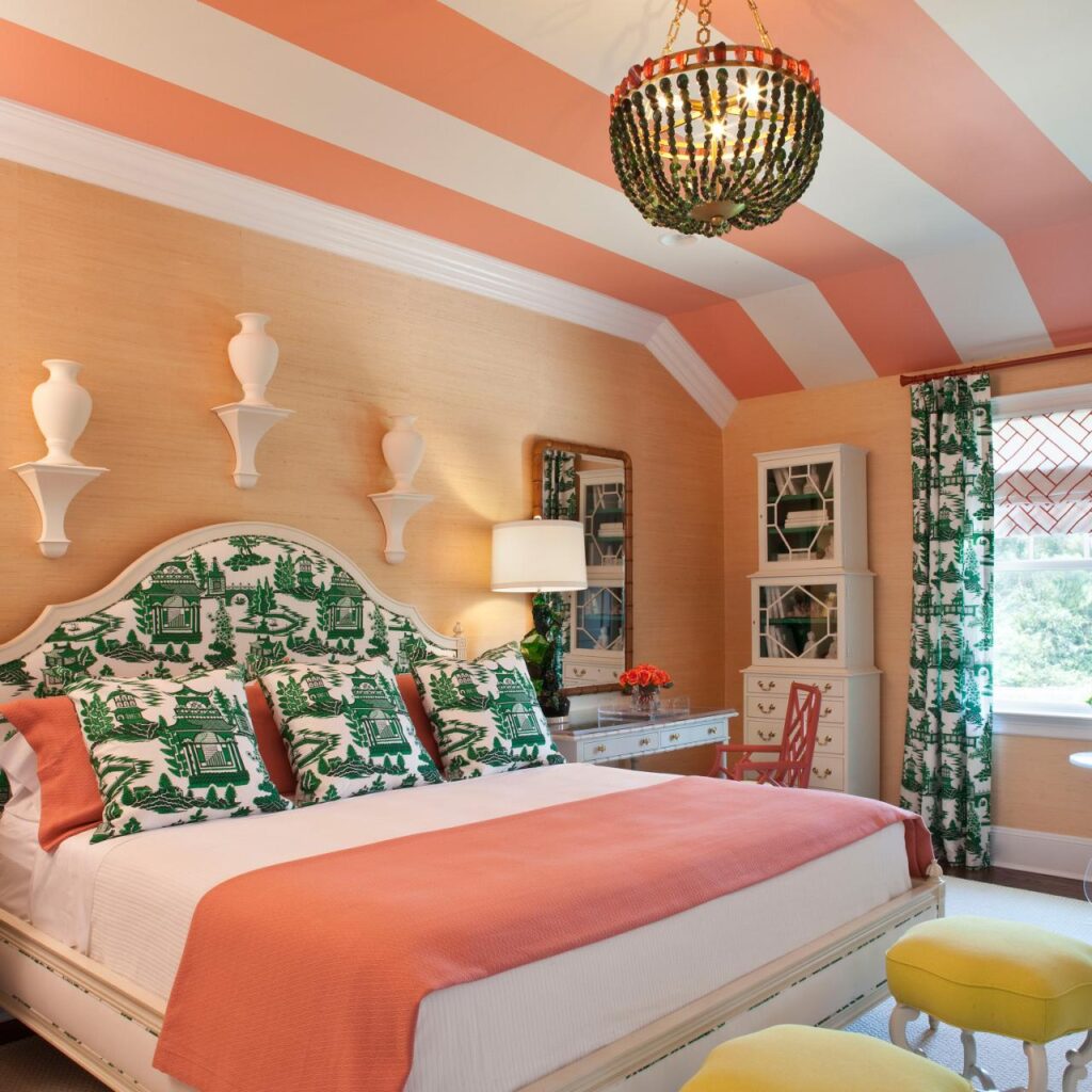 For example, a room color-wrapped in warm- toned stripes will help to create the illusion of an intimate space that you can then accentuate with contrasting a green (advancing) accent pillows and drapes.