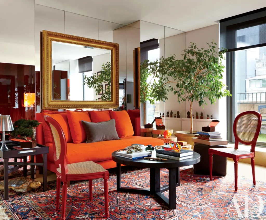 Alternatively, if you choose to paint a room in a warm color scheme, brick red, Amy says, “I’d go for big pieces of (receding) deep greens and blues for depth, contrast, and richness such as a chunky chair or sofa.”